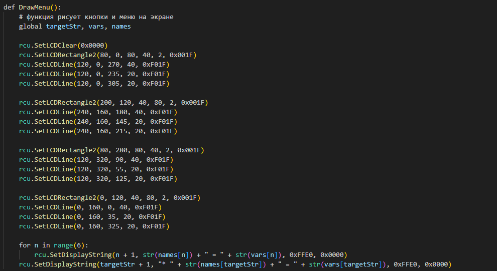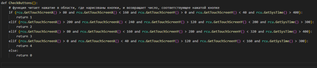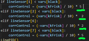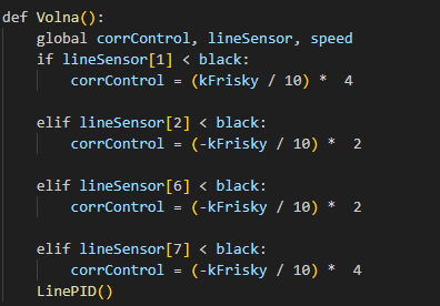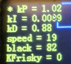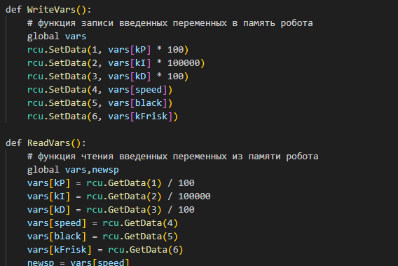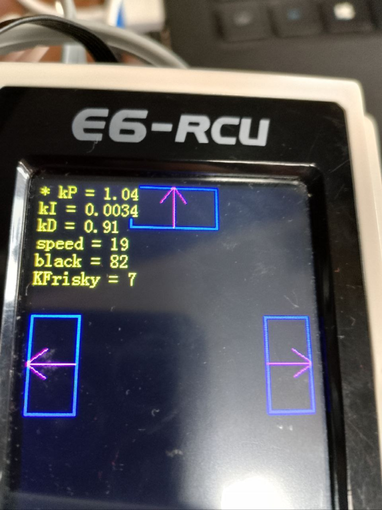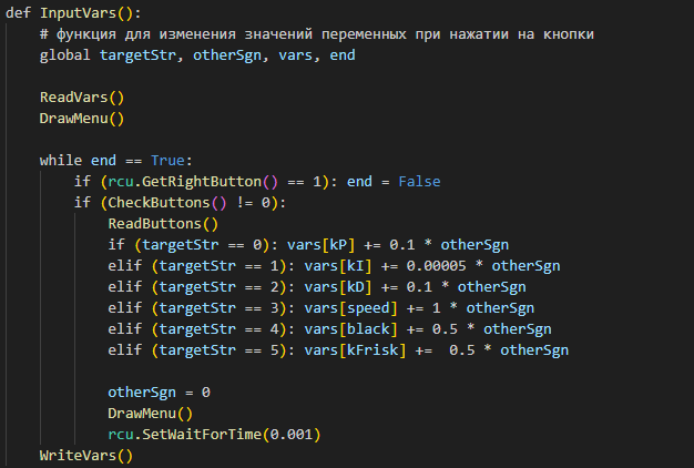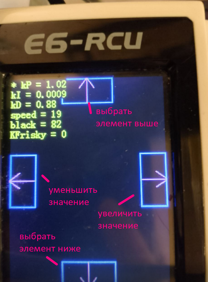 На фото изображены 4 кнопки, с помощью. которых можно производить изменения переменных, которые в дальнейшем будут использоваться в движении по линии. Это было сделано, чтобы настраивать значения прямо с контроллера, не отходя от полигона, чтобы не подключать робота к компьютеру, не изменять в программе коэффициенты и т.п