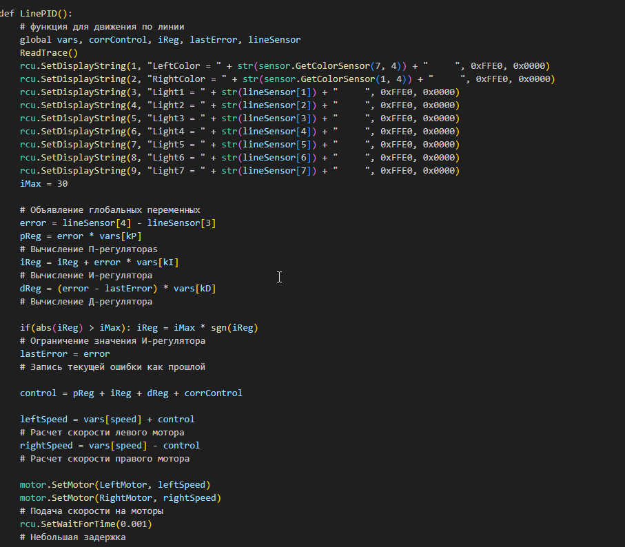iMax, error, pReg, iReg, dReg, lasterror, control — переменные PID-регулятора.